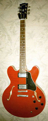 • rechts: Gibson ES335, USA, ca. 1985. Diese edle Halbakustikgitarre habe ich vor ein paar Jahren bei einer Sammlungsauflösung erstanden. Es ist die gleiche, die Alvin Lee in Woodstock gespielt hat. Allerdinx wollte ich mir dann doch keinen Peace-Aufkleber draufpappen ...